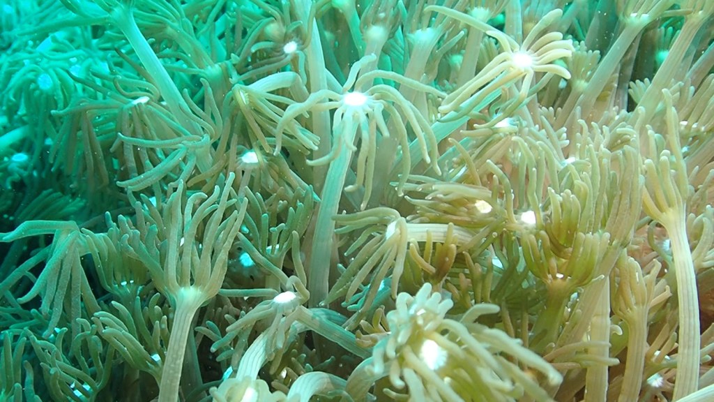 Of particular interest to me were a number of species of the Genus Alveopora, at least one of which is potentially new to science. The Alveopora are special for a number of reasons. They are beautiful animals, with long flowing polyps that waft gently in the surge.