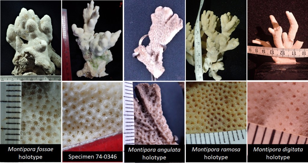 Montipora fossae Crossland 1952 was synonymized with M. angulata (Lamark 1816; Fig. 1) by Veron & Wallace 1984. Comparing the holotypes of each suggests Veron & Wallace 1984 were in error. The branches in M. angulata are laterally compressed, whereas those of M. fossae are round; M. angulata has prominent coenosteum ridges which are absent in M. fossae; and finally the corallites are foveolate in M. angulata but not in M. fossae.