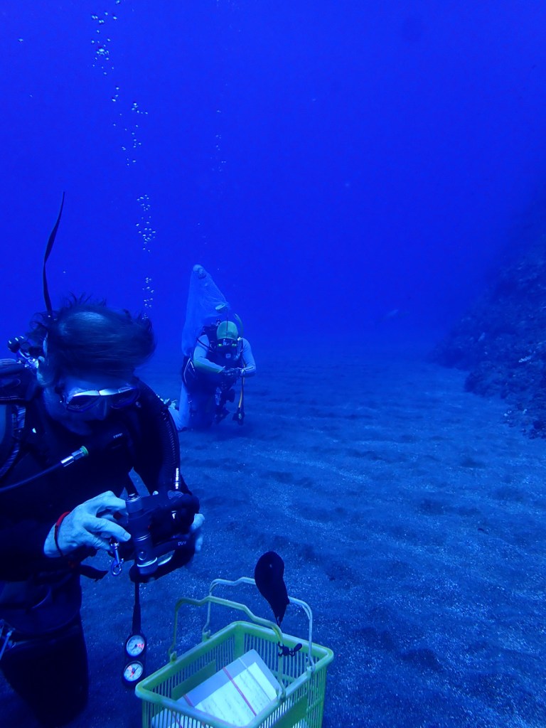 To visit the Islands, I joined a team led by Dr James Reimer from the University of the Ryukyus and colleagues from the Okinawa Institute of Marine Science. The World Heritage listed islands have a certain mystique. The only way to get there is a 24 hours long ferry ride from Tokyo. The colour of the water is known as Bonin Blue – a deep reflective blue that you only see in the open ocean. The visibility on our dives was regularly over 40 m.