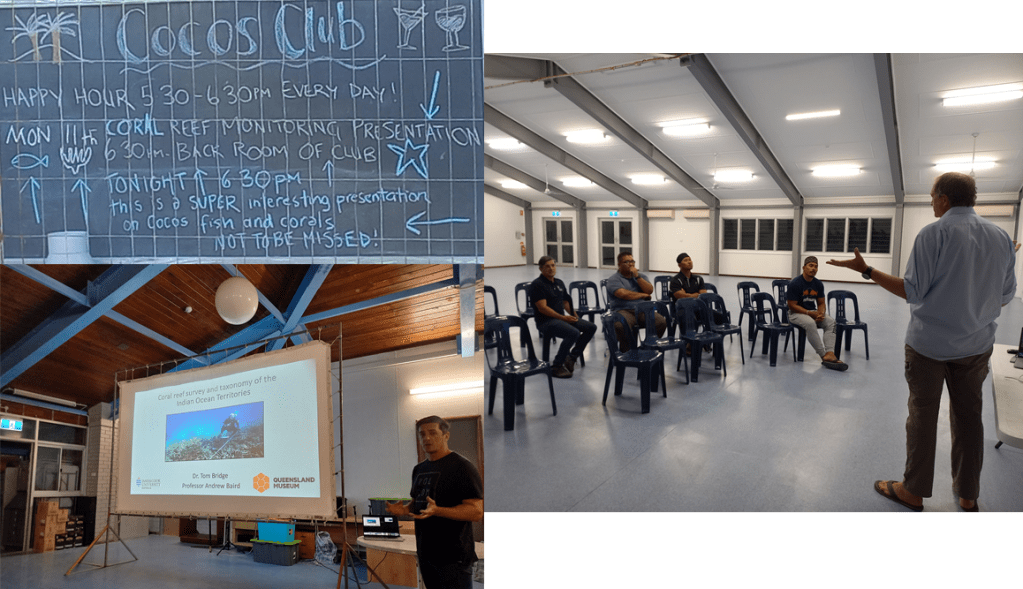 - Three public lectures on our plans for research and monitoring of the coral reefs while on Cocos (Keeling) Island