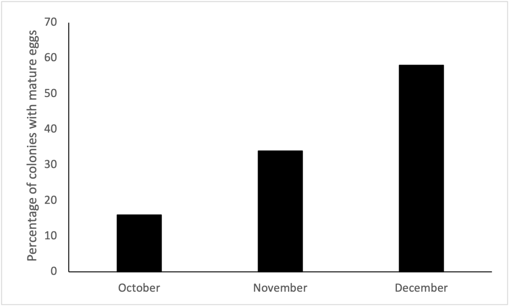 The surveys have established that in Flying Fish Cove, the spawning season extends over at least three months with some spawning predicted to have occurred following the full moons in early October, November and December 2023 (Fig. 2).