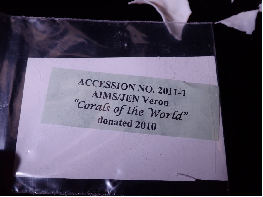 The Queensland Museum Tropics (MTQ) collection includes the label of the holotype with a note that “type material still with Veron” (Fig. 3). In addition, there are four more lots at MTQ with registration numbers G70061, G70062, G70063, G70064. These lots include between 1 and 5 fragments with labels suggesting they were collected by Veron from Amitori Bay, although there is no date of collection on the label (Fig. 4). They are almost certainly specimens of L. amitoriensis, however, they are not specifically mentioned by Veron in the original description and therefore should not be a part of the type series and are probably best considered as vouchers and topotypes. Another label with the lot G70063 with accession number 2011-1 suggests these specimens were given to the Museum in 2011 (Fig. 5). Veron was recently quizzed on the provenance of these specimens and replied that he could not remember, which is fair enough, but a good lesson we can all learn from in the importance of keeping good field notes when collecting.