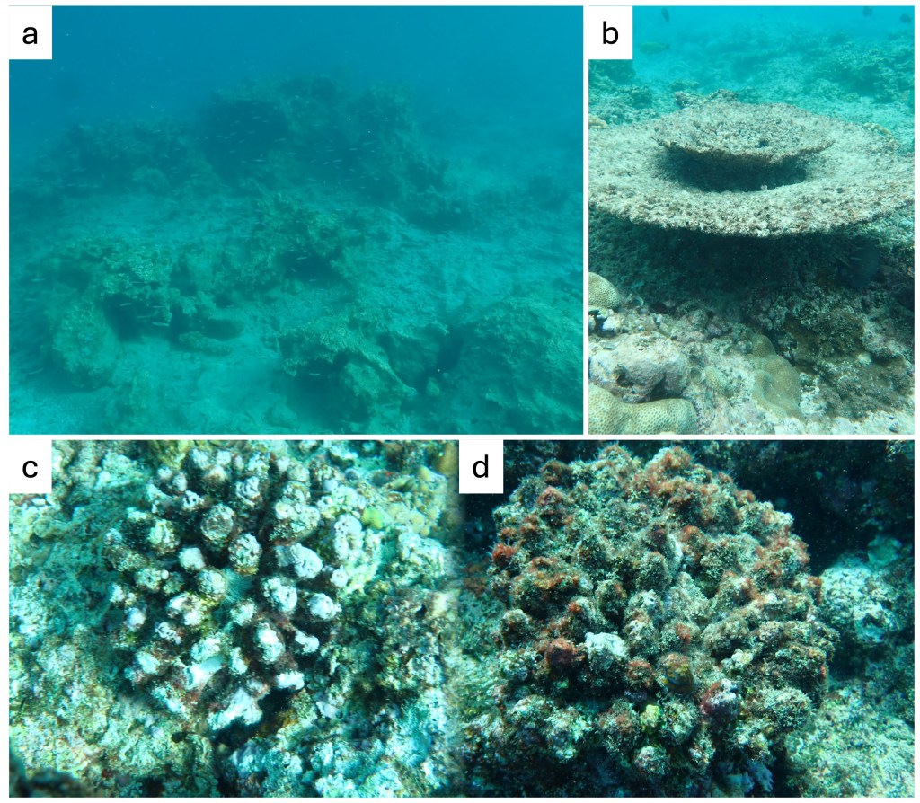 The general devastation was relieved by the occasional patches of abundant Montipora and Heliopora and at some sites there were several Acropora recruits (Figure 2). In terms of present potential threats, I saw one crown of thorns starfish, one incidence of black band disease, and little in the way of plastic on the reef, despite plastics and other rubbish choking the waterways on land.