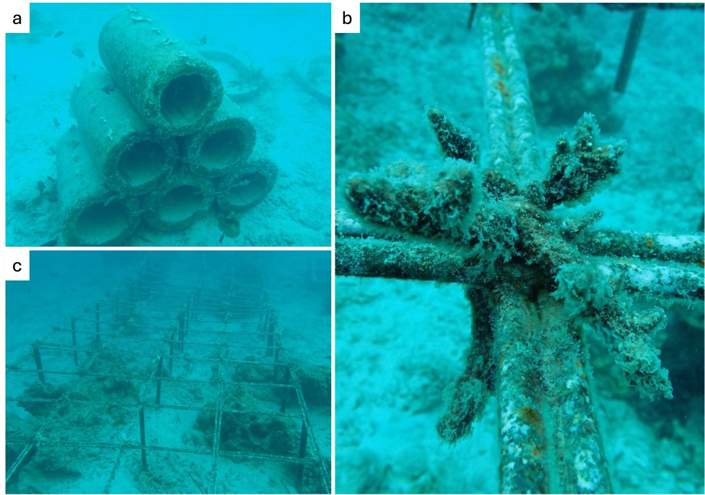 The provincial government’s tourist department has made at least one attempt at a reef restoration project at Tuapejat. This consists of a series of concrete pipes and large metal frames placed on the sand on the reef slope with coral fragments cable tied to the surface of these structures (Figure 3). Many of these fragments were already dead and the others are likely to die soon given the state they were in.