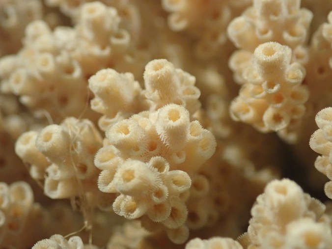 The holotype of A. kalindae (collection number QMT G78731) is a fragment of a larger colony growing at 5 m depth on the outer reef crest of Myrmidon Reef, which is located on the outer GBR north-east of Townsville. This colony is a side-attached plate with dense branches that fuse towards the colony centre. The colour is a pale pinkish-brown, which comes from contrasting colours of the axial / radial corallites which are pale pink to cream, and the polyps that are a darker brown (Figure 1). At the time of collection in daylight hours, the tentacles of the polyps were partially extended, and each polyp had a single long, semitransparent directive tentacle.